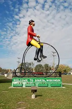 Sparta is at one end of the Elroy-Sparta State Trail. Opened in 1967, this is considered to be the first rail trail conversion. It is a 32-mile (51 km) bike trail that was redeveloped from an abandoned railway and passes through rural scenery and three tunnels. It is part of the larger Wisconsin bike trail system operated by the state of Wisconsin.[17] Based on this, Sparta dubs itself the "Bicycling Capital of America"; the entrance to the town is marked by an oversized sculpture of a bicyclist on an old-fashioned penny farthing high-wheel bicycle. The statue, named Ben Bikin', has been given the title of "World's Largest Bicyclist."[18] An annual bike ride held annually in October and called the "Will to Ben" runs between the Ben Bikin' statue with another from the same mold, named Will B. Rolling, which is located in Port Byron, Illinois.[19][20]