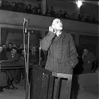 In November 1944, the socialist partisans (LANÇ) took power and began immediately with the arrest of all public figures who were perceived to have collaborated with the occupiers or not to have supported the LANÇ before. The Bashkimi newspaper of the Democratic Front of Albania had already been coming out in early January 1945 with agitative editorials pointing to "traitors" and "people's enemies".[4] Sixty of these public figures were the object a treason trial in March 1945 at a socialist Special Court with Prosecutor Koçi Xoxe.[5] Xoxe, Minister of Interior, was considered from some as the most powerful person in Albania for the moment.[6]