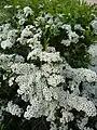 Spiraea × cinerea is a species of flowering plant in the rose family. It is a hybrid of garden origin (S. hypericifolia × S. cana). Growing to 1.5 m (4.9 ft) tall and wide, this compact deciduous shrub bears small, lanceolate leaves and multiple white blooms along its arching stems in spring.