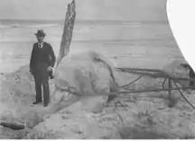 Between January 9 and January 15, a storm tide dragged the carcass out to sea, but it washed ashore again on the next tide, on Crescent Beach, two miles to the south of its original location. Webb sent photographs of the mass, along with a description, to Joel Asaph Allen of the Museum of Comparative Zoology at Harvard. Allen apparently did not respond, but Webb's letter came to the attention of Prof. Addison Emery Verrill of Yale, at that time the foremost authority on cephalopods in the country. At first, Verrill suggested the carcass might represent the remains of a giant squid. In the January 1897 issue of the American Journal of Science he wrote:[7]