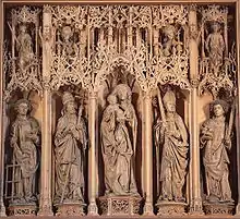 The high altar contains numerous figures, reliefs and decorative attachments. The altar is 11.64 metres high and 7.68 metres wide and contains three parts (predella, shrine with side panels and a superstructure). During the Second World War, the altar was dismantled. The figures and the relief panels from the sides survived in the Kochberg salt mines at a depth of 200 metres, while the superstructure and the shrines were walled in the western tower of the church. The decision to begin reconstruction came after long deliberations and with the approval of the monument administrator, Count Adelmann. In seven years the parts that had been destroyed were reconstructed by the restorer Walter Hammer and sculptor Josef Wolfsteiner.[9]