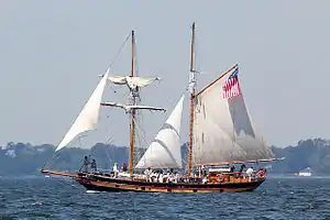 Sail plan2,500 square feet, 11 sails in a brigantine rig