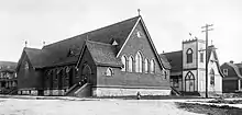 The Anglican Parish of St Paul was established at a time when the population of Vancouver was rapidly expanding. In response to a demand from a small group of St James' parishioners, a vacant lot was purchased and a daughter church was built in 1889. The parish was established in 1891.[2] The church was located at the centre of the geographically-defined parish, but in 1898 it was placed on skids and moved north-west, away from railway yards in Yaletown and closer to where most parishioners lived in the West End.[3] In 1905, it was replaced by a larger church, and the old church became the parish hall.