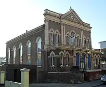 Success was assured after the Duchess of Kent and her daughter Princess (later Queen) Victoria stayed in the town in 1834,[9] and residential development northwards along the inland valley occurred after St Leonards Warrior Square railway station was built in 1851, making London and Brighton accessible by train.[10] By that time, churches existed for Congregationalists,[11] Anglicans[12] and Roman Catholics.[13] In 1882, architect Thomas Elworthy of the firm Elworthy and Sons was commissioned to design a church for the town's growing Baptist community.[14] The chosen site was on Chapel Park Road, near the railway station.[14] Elworthy was from St Leonards-on-Sea and was a prolific church architect, principally for the Congregationalists.[15] His late 19th-century designs tended towards the Renaissance Revival and Classical styles, in reaction to the almost universal use of Gothic Revival forms earlier in the century.[16] As an architect, he was "much maligned":[16] his Congregational chapel of 1881 in Robertsbridge was described as "truly horrible" by Nikolaus Pevsner, for example.[17] Two other Elworthy churches in the Hastings area, Congregational churches on The Croft and Mount Pleasant Road, were demolished in 1972.[13]