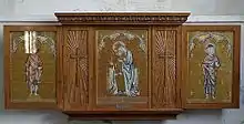 The embroideries displayed around the church include the reredos behind the altar in the Lady Chapel showing The Virgin and Child flanked by St James and St John the Baptist are by Percy Sheldrick (1890–1979) of Ashwell who worked as a master weaver and embroiderer at William Morris' Morris & Co. workshops at Merton Abbey Mills during the 1920s. His greatest work was 'The Passing of Venus' from a design by Pre-Raphaelite Brotherhood artist Edward Burne-Jones and which includes 18 life-size figures; it is now in Lansing Community College in Michigan. He left Merton Abbey Mills in 1939 and returned to Ashwell to work for an antique dealer. There, he acted as Verger at St Mary's. Sheldrick continued to embroider in his spare time and his work can be found in collections and institutions all round the world.[2]