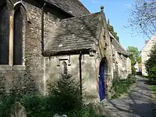 The church has a nave with a north aisle and vestry, a Perpendicular Gothic west tower, a chancel and a south porch.[6] The nave was rebuilt in the late 15th or early 16th century to meet a tower of approximately the same age; it is often dated to 1521, but appears to be built on older foundations.[1] The southern side of the nave contains what are probably thirteenth-century buttresses and a pair of Perpendicular Gothic windows.[7] The north aisle was originally built in the 13th century,[1] and rebuilt by H.J. Underwood in 1890; the vestry was built in the 17th century and rebuilt in 1846 to designs by Chamberlain, through the generosity of the curate, Alexander Penrose Forbes.[1] The church has been reroofed at least twice, in 1825 and 1897.[1]
