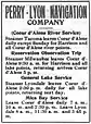 - Perry-Lyon Navigation Company. Formed in April 1909 by the merger of the former competitors, the Perry and the Lyon companies.[34] The new concern would operate the Lyons boats (Tacoma and Lyondale) and the Perry boats (Milwaukee and Spray).[34] Formally incorporated on April 19, 1910.[35]