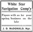 In the early 1900s, there was an intense rivalry on the lake and the rivers between two companies.[6] One concern was the Coeur d’Alene and St. Joe Transportation Company, later known as the Red Collar Line, which had been formed by Joseph Clarence "J.C." White and Jim Spaulding and his son, Harry.[6] The other company was White Star Navigation Co., also known as the White Star Line, which had been incorporated by Capt. George Reynolds and McDonald.[6]