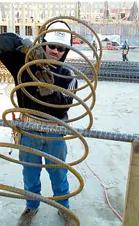 A steel fixer (UK, ironworker or "rod buster" in the United States) is a tradesman who positions and secures steel reinforcing bars, also known as rebar, and steel mesh used in reinforced concrete on construction projects.[1]