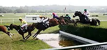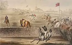 The steeplechase originated in Ireland in the 18th century as an analogue to cross-country thoroughbred horse races which went from church steeple to church steeple, hence "steeplechase". The first steeplechase is said to have been the result of a wager in 1752 between Cornelius O'Callaghan and Edmund Blake, racing four miles (6.4 km) cross-country from St John's Church in Buttevant to St Mary's Church (Church of Ireland) in Doneraile, in Cork, Ireland.[1] An account of the race was believed to have been in the library of the O'Briens of Dromoland Castle. Most of the earlier steeplechases were contested cross-country rather than on a track, and resembled English cross country as it exists today. The first recorded steeplechase over a prepared track with fences was run at Bedford in 1810, although a race had been run at Newmarket in 1794 over a mile (1600 m) with five-foot (1.5 m) bars every quarter mile (400 m).[2] and the first recorded steeplechase of any kind in England took place in Leicestershire in 1792, when three horses raced the eight miles from Barkby Holt to Billesdon Coplow and back.[3]