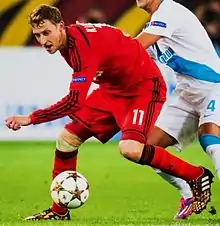 After arriving in Leverkusen, he netted eight goals in the 2006–07 season,[15] 16 goals in the 2007–08 season,[16] and 14 goals in the 2008–09 season.[17] On 5 April 2009, he scored his side's first goal in a 2–0 win over 1. FC Köln, keeping alive Leverkusen's chances of qualifying for Europe for the following season.[18] Leverkusen trailed off following the win, eventually falling to ninth place in the final Bundesliga standings.[19]