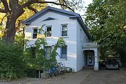 The building proper was constructed in 1853 and has been recognized by the Ann Arbor Historical Commission; one of the pillars on the front porch bears a plaque which identifies it as the Hubbell Gregory House. Gregory was the original owner of the house and his descendants lived there until 1914, when his daughter Jennie Gregory died.[1] Afterwards it became the residence of the family of Horace Greely Prettyman, who owned the Ann Arbor Press and White Swan Laundry.[1] They added the porte cochere at this time.[1] The Prettyman family lived here until around 1945, after which Abbie Schaefer took it over and ran it as a rooming house called Abby House.[1]