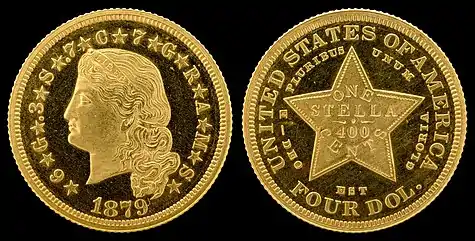 It was originally minted as a coin tied to Latin Monetary Union standards, in preparation for possible U.S. entry to the Union. Two varieties of the Stella were made: Liberty with flowing hair, designed by Charles E. Barber, and with coiled hair, designed by George T. Morgan.[1] The flowing hair variety is the most commonly seen variety. Even though the coin was designed as a pattern coin,[2] similar to the Gobrecht dollar, many catalogs list the coin as a regular-issue item.