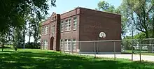 A flagpole is located outside the main entrance to the school building, and is included in the NRHP listing as a contributing feature. A set of gym bars, a tether ball pole, a swing set, a "slippery slide", and a merry-go-round are located on the south and west sides of the property, and are all listed as contributing features. A fenced tennis and basketball court is located on the north side of the property, and a large track and playing field are located on the west side of the property, but none of these features are included in the listing.[1]