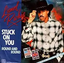 The song marks Lionel Richie's country music debut, and indeed, "Stuck on You" peaked at number 24 on the country chart.[3] As such, the single's cover photo shows Richie wearing a cowboy hat.