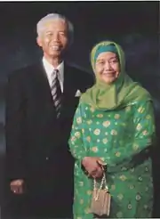 Sudharmono married Emma Norma in 1951, and together, they have three children. Sri Adyanti Sudharmono, Sri Aryani Sudharmono, and Tantyo A.P Sudharmono.[38] As of 2021, Tantyo Sudharmono serves as the Chairman of the Indonesian National Council for Social Welfare.[40] Emma Norma outlived Sudharmono by 6 years, dying in 2012, at Pertamina Central Hospital, Jakarta. Her body is also interred at the Kalibata Heroes Cemetery, Jakarta.[41]
