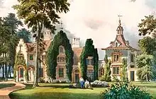 This cottage-like estate, designated a National Historic Landmark in 1962,[4] reflects Dutch Colonial Revival, Scottish Gothic, and Tudor Revival influences,[5] with its wisteria-covered entrance and jagged crow-stepped gable.