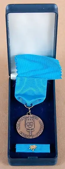 The Swedish Armed Forces International Service Medal[1] (Swedish: Försvarsmaktens medalj för internationella insatser, FMintBM[2][I]) is a Swedish reward medal instituted by the Swedish Armed Forces in 1991. The medal regulations has been revised twice, in 1994 and 2012. The medal is awarded after at least 30 days of international service.