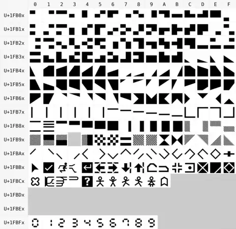 | U+1FB8x | 🮀 | 🮁 | 🮂 | 🮃 | 🮄 | 🮅 | 🮆 | 🮇 | 🮈 | 🮉 | 🮊 | 🮋 | 🮌 | 🮍 | 🮎 | 🮏 |