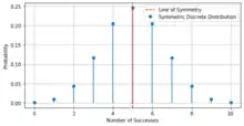 In statistics, a symmetric probability distribution is a probability distribution—an assignment of probabilities to possible occurrences—which is unchanged when its probability density function (for continuous probability distribution) or probability mass function (for discrete random variables) is reflected around a vertical line at some value of the random variable represented by the distribution. This vertical line is the line of symmetry of the distribution. Thus the probability of being any given distance on one side of the value about which symmetry occurs is the same as the probability of being the same distance on the other side of that value.