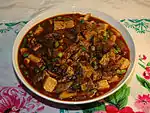 | Mapo doufu | ![]() | 麻婆豆腐 | 麻婆豆腐 | mápó dòufǔ | Literally "pockmarked Ma's tofu". Spicy sauce similar to yuxiang ("in the style of fish") sauce.[16] |