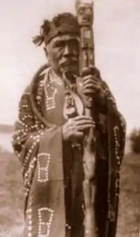 A Kwakwaka'wakw man with a talking stick, photo by Edward S. Curtis