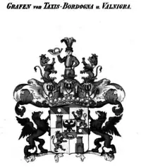 The House of Taxis-Bordogna und Valnigra is the name of an old Austro-Italian noble family whose members held the position of Imperial Hereditary Postmaster. The family was formed by the descendants of Elisabeth von Taxis († 1518) and her husband Bonus von Bordogna. Elisabeth Taxis was a sister of the Brussels Postmaster General Johann Baptista of Taxis (1470–1541), the ancestor of the Princely House of Thurn and Taxis.