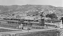 Tenders for the 11 mi 41 ch (18.5 km) extension of the NIMT from Ōtorohanga to Te Kuiti were invited in August 1885.[7] However, from 17 September 1885[8] work was suspended[9] after William Russell got Parliamentary support to cut spending on public works.[10] A year later Coates & Metcalfe of Hamilton won the construction contract for £17,273 in September 1886[11] and work started quickly.[12] The line opened on 2 September 1887 for goods.[13] By October 1887 goods trains ran on Mondays and Fridays and the station was being built.[14] A contract with Arthur Burn for the station buildings was signed on 29 August 1887 and they were completed by 19 December.[8] New Zealand Railways Department took over from the contractors, adding a passenger service on those days from 2 December 1887.[15] Te Kuiti was the terminus for over a year, until the 8 mi 65 ch (14.2 km) extension to Puketutu opened on Wednesday 8 May 1889. By November 1889 Te Kuiti had lost its stationmaster and become a flag station. However, by 1896 there was a 4th class station, platform, cart approach, 40 ft (12 m) by 30 ft (9.1 m) goods shed, cattle yards, water supply from a well, coal bunker, engine shed, loading bank, urinals and a passing loop for 31 wagons. There was a Post Office at the station until 1907, when a stationmaster was reappointed and railway houses, a 50 ft (15 m) turntable and more sidings were built.[8]