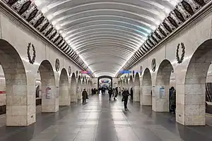 Tekhnologichesky Institut (Russian: Технологи́ческий институ́т, IPA: [tʲɪxnəlɐˈɡʲitɕɪskʲɪj ɪnstʲɪˈtut]) (English: Technology Institute) is a cross-platform interchange station of the Saint Petersburg Metro. The station consists of two halls, both serving the Kirovsko-Vyborgskaya Line and Moskovsko-Petrogradskaya Line trains. The first hall serves the southbound trains, while the second hall serves the northbound ones.