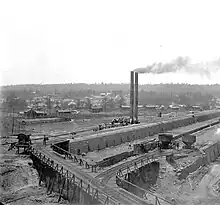 Canny investments and the purchase of major competitors in 1888 and 1892 under the direction of financier Hiram Bond, TCI Corporate General Superintendent, saw the firm grow rapidly. The corporation was for several decades one of the few major heavy industries based in the largely agricultural Southern United States,[5] by a wide margin the largest blast furnace operator in the South and at one time the second largest steel producer on the continent.[3][5] Its 1900 asset sheet listed 17 blast furnaces, 3256 beehive coke ovens, 120 Solvay coke ovens, 15 red ore mines,[3] as well an extensive network of railroads, although following the panic of 1893 the company shifted its primary interests from railroads to steel.[2] TCI's largest industrial plant was located in Ensley, a company town founded in 1886 on the outskirts of Birmingham, Alabama, by company president Enoch Ensley. Ensley was served by the sizable Birmingham Southern Railroad, one of TCI's early acquisitions, and from 1899 contained four 200-ton blast furnaces. In 1906 two more furnaces were constructed, and 40,000 tonnes of steel were produced that year, feeding Ensley's integrated rail, wire and plate mills. The company was fiercely competitive with the larger Pittsburgh steel businesses to the north, owing to the remarkable fact that all the natural resources required to produce steel were located in abundance within a relatively small radius of the Birmingham mills.[6]