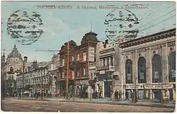 The Ter-Abramyan House was built in 1886. It was designed by famous Rostov architect Nikolay Matveyevich Sokolov. Dwellings in the building were rented. Ter-Abramyan printing-office worked at the ground floor. It issued books, calendars, newspapers and other. Along with the printing-office Donskaya pchela (Russian: Донская пчела, literally Don bee) newspaper editorial office worked.[3] Also shops and photo studios, where worked photographers: Isakovich, G. A. Shifrin, B. P. Mishchenko, occupied the ground floor. Vechrneye vremya (Russian: Вечернее время, literally Evening time) newspaper editorial office was located in the Ter-Abramyan House in 1918.[4]