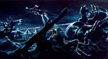 Concept art illustrating the conflicts between Skynet and the Resistance in a post-apocalyptic, futuristic setting, envisioned by creator James Cameron for the 1984 film The Terminator.