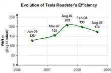 According to the U.S. EPA, the Roadster can travel 244 miles (393 km) on a single charge of its lithium-ion battery pack.[15] The vehicle can accelerate from 0 to 60 mph (0 to 97 km/h) in 3.7 or 3.9 seconds depending on the model. It has a top speed of 125 mph (201 km/h). The Roadster's efficiency, as of September 2008, was reported as 120 miles per gallon gasoline equivalent (28 kW⋅h/100 mi) (2.0 L/100 km). It uses 21.7 kWh/100 mi (135 Wh/km) battery-to-wheel, and has an efficiency of 88% on average.[16]