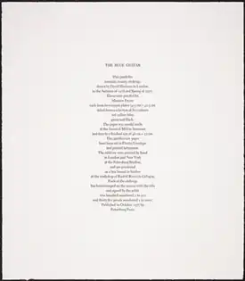 "This catalogue documents the publication of 'The Blue Guitar', a group of etchings by David Hockney, accompanied here by a poem of Wallace Stevens 'The Man with the Blue Guitar". The portfolio contains twenty etchings drawn by the artist in London in the Autumn of 1976 and Spring of 1977"[3]