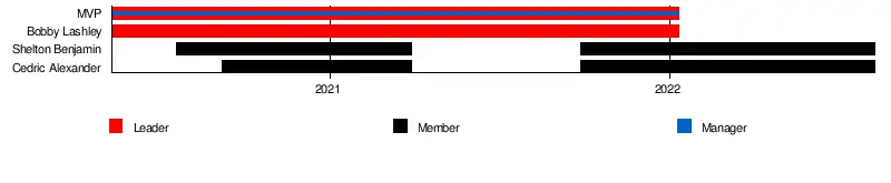 For much of its existence, the group had composed of MVP, Bobby Lashley, Shelton Benjamin and Cedric Alexander and the stable was the centrepoint of the ThunderDome era during the COVID-19 pandemic. The group held four different championships seven times with Lashley held the WWE and United States Championships while Alexander and Benjamin held the Raw Tag Team Championship once and the 24/7 Championship four times each (Benjamin held it three times and Alexander held it once). The group was gradually disbanded after Lashley and MVP left the group in early 2022 but Alexander and Benjamin continued to function as a tag team under The Hurt Business name until that August.
