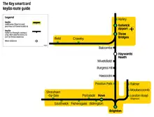 keyGo is a pay-as-you-go system which can be added to Key smartcards provided by Govia Thameslink Railway.[7][8] It is also valid for pay-as-you-go and PlusBus travel on some MetroBus and Brighton & Hove buses, as well as on GTR services between many stations on their network.[9]