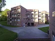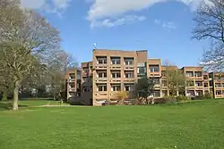 In 1961, Isi Metzstein and Andrew MacMillan of Glasgow-based firm Gillespie, Kidd and Coia were appointed to design accommodation for a further 1,000 students at The Lawns. They designed a series of twelve halls, each comprising five blocks identified by the letters A to E, and accommodating approximately 140 residents. A typical block configuration was three floors, with each floor accommodating nine students in seven rooms. The scheme was constructed between 1962 and 1968, when six of the projected twelve blocks were complete.[3] In that year, The Lawns was awarded a RIBA Bronze Regional Award.[4] In 1993, the six contemporary halls were designated as Grade II* listed buildings and are recorded in the National Heritage List for England, maintained by Historic England.[5][6][7][8][9][10]
