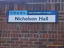 Nicholson Hall was the fifth hall of the Lawns Complex. It takes its name from the principal of Hull University College in 1935, John Nicholson. Nicholson led the campaign to achieve the college's independence, which eventuated on 13 May 1954. Nicholson Hall housed approximately 142 students in both medium and en-suite rooms. This was the only self-catered Hall on the Lawns Complex.[1] Most rooms have washbasins and a balcony. In 2009 Nicholson Hall was re-furbished converting all double rooms to singles, updated kitchen diner kitchens similar to the Downs and Morgan Hall designs with additional en-suite facilities in particular blocks.