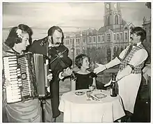 A patron being serenaded by the head waiter, with Mr and Mrs George Miller playing the violin and accordion respectively. Music Hall Theatre Restaurant, April 1965.