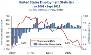 Ultimately, Grunwald accounts how Obama's $787 billion stimulus package amounted to about 4% of America's GDP while, during the Great Depression, the biggest stimulus in any year amounted to just about 1.5% of GDP. The President's early, pre-inauguration plan, at $300 billion, increased given the particularly frustrating unemployment situation. Early 2009 data had presented losses of around 800,000 a month.[2]