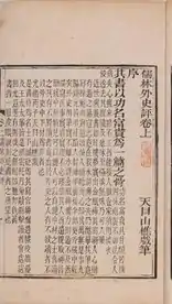 The earliest printed editions of the novel did not survive, and some critics have raised questions about the reliability of later printed editions.[12] The earliest extant edition of The Scholars is the 1803 Wo Xian Caotang edition, commonly referred to as the "Wo" edition. This was followed in 1816 by the Qingjiang Pu Zhu Li Ge ("Qing") and Yi Gu Tang ("Yi") editions, which are both essentially copies of the Wo edition. The Suzhou Fan Shi Chao ("Chao") edition was the personal reading edition of a Qing official. While this edition was quite rare, the following Suzhou Qun Yu Ji ("Su") edition was quite popular, and there are many extant versions of it in circulation. The first Shen Bao Guan ("Shen One") edition corrected the mistakes of previous editions, and the second Shen Bao Guan edition ("Shen Two") carried these corrections further.[13]