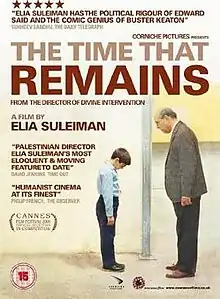 The Time That Remains is a 2009 semi-biographical drama film written and directed by Palestinian director Elia Suleiman. The film stars Ali Suliman, Elia Suleiman, Saleh Bakri and Samar Qudha Tanus. It gives an account of the creation of the Israeli state from 1948 to the present. Suleiman participated in the 2009 Cannes Film Festival, as his new film competed in the official selection category.[1] The Time That Remains was also screened at the 2009 Toronto International Film Festival.[2] In November 2009, the film won the Jury Grand Prize (with About Elly) at the Asia Pacific Screen Awards. The film won the Critics Prize of the Argentinian Film Critics Association at Mar del Plata International Film Festival.[3]