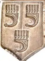 There are several heraldic escutcheons on the monument displaying the arms of Grenville: Gules, three clarions or. The monument is an important early source for use in deciphering the form of these mysterious and unexplained charges that are still borne by distant relatives, Baron Grenfell,[18] and are borne in the 3rd quarter by Earl Granville.[19]