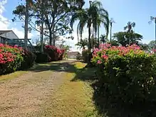 Running north–south through the centre of the ornamental garden is an avenue of trees aligned with the front trellis archway, marking the location of a former pedestrian pathway. This avenue includes Cabbage Palms (Livistona australis) and Date Palms. To the west of the pathway is a mulched area and two Cocos palm trees which indicate the location of a former circular garden bed. To the east lies a bougainvillea shrub with purple-pink flowers (possibly a variegated bougainvillea) and a guava tree, which are all that remains of a large wedge-shaped garden bed. A Bribie Island Pine is also located in this area.[1]