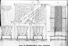 In late 1832, Hall became mining engineer at South Hetton in addition to his other duties. Over the next four years, he made his first major contribution to the mining industry by developing the tub, cage and guide-rod system for raising coal from the pit,[5][2] Established practice had been to bring coal to the surface in wicker baskets or "corves". These had increased in size over the years from 3 cwt. to about 6 cwt., making them difficult to fill and handle underground and prone to snagging while being lifted in the shaft. Adding to the difficulties was the common practice amongst miners of hanging to the ropes or lifting chain to ascend and descend the 1500 ft or more of the pit shaft. Hall replaced the corves with low tubs which ran on rails underground. Initially these were emptied at the shaft bottom, but he subsequently developed a frame or cage into which several tubs could be loaded for lifting. To prevent the cage fouling the sides of the shaft, he developed an idea proposed initially by a Mr. Curr of Sheffield and fitted guide rods to constrain it. A model of the system was exhibited at the Polytechnic Exhibition, Newcastle, and the Museum of Practical Geology, London.