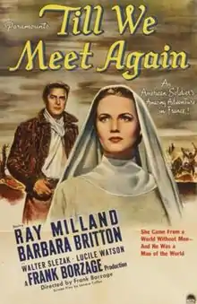 Till We Meet Again is a 1944 American drama film directed by Frank Borzage, written by Lenore J. Coffee, and starring Ray Milland, Barbara Britton, Walter Slezak, Lucile Watson, Konstantin Shayne, Vladimir Sokoloff and Mona Freeman.[1][2][3] It was released on August 30, 1944, by Paramount Pictures.