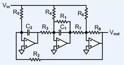 The circuit depicted to the left, based on a GIC (generalized impedance converter), has finite non-zero transmission zeroes.[1]: 304–308