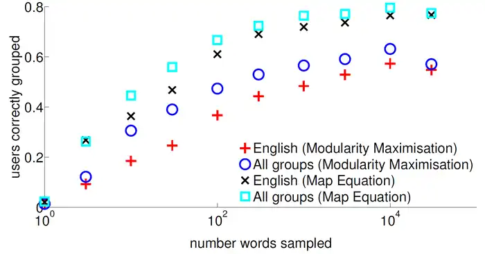 The problem of detecting the community features is one of the main issues in the study of networking systems. Social networks naturally tend to divide themselves into communities or modules.[18] However, some world networks are too big so they must be simplified before information can be extracted.[19] As a result, an effective way of dealing with this drawback for smaller communities is by using modularity algorithms in order to partition users into even smaller groups.[18] For larger ones, a more efficient algorithm called 'map equation' decomposes a network into modules by optimally compressing a description of information flows on the network.[19] Each community was therefore characterised according to the words they used the most, based on a ranking algorithm. To determine the significance of word usage differences, word endings and word lengths were also measured and showed that the pattern found was the correct one. Moreover, these studies also helped in predicting community membership of users, by comparing their own word frequencies with community word usage. This helped in forecasting which community a certain user is going to access based on the words that they are using.[11]
