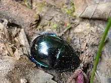 Trypocopris pyrenaeus can reach a length of 12–26 millimetres (0.47–1.02 in).[3] These beetles are blackish, with green, blue and violet glare. The elytra are shiny and rather smooth, without any striae. The pronotum is a little punctured.[4]