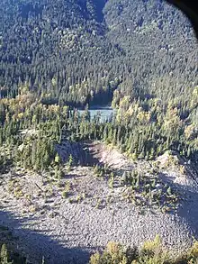 Lichens and mosses cover large portions of a lava flow sequence originating from Tseax Cone. They range in colour from green to yellow and reach thicknesses of a few centimetres.[19] In the Tseax River valley, the lava flows have been almost completely covered by dense rainforest. In some places the lava flows are obscured by streams and small lakes. This includes Vetter Creek, Ross Lake and the Tseax River, all of which are in the Tseax River valley.[20] Melita Lake and Lava Lake have ponded behind the lava flow sequence, although Lava Lake had already existed before the lava was issued; it merely increased in depth.[21]